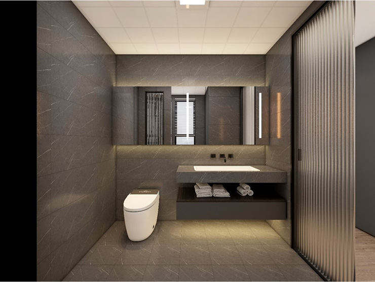 卫生间说明:卫生间整体采用整砖铺贴,配合灯光更显宽敞,将空间划分明确,实用性强,简洁明了。相互使用不受影响,整体光源充足。