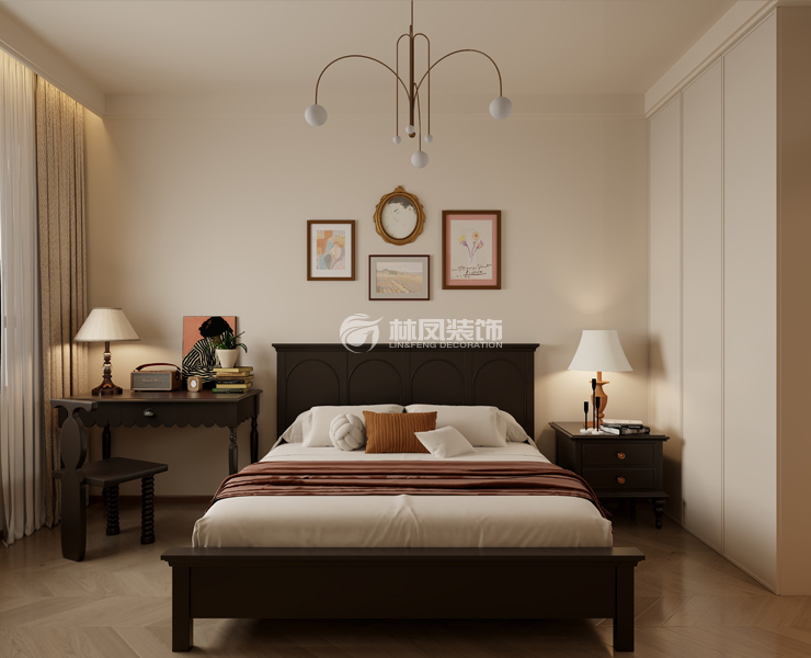 卧室说明:卧室的颜色和房屋整体颜色一致,卧室部分选用颜色显得沉稳不浮夸,配上床饰舒适度强,能给户主在家的感觉放松到极致