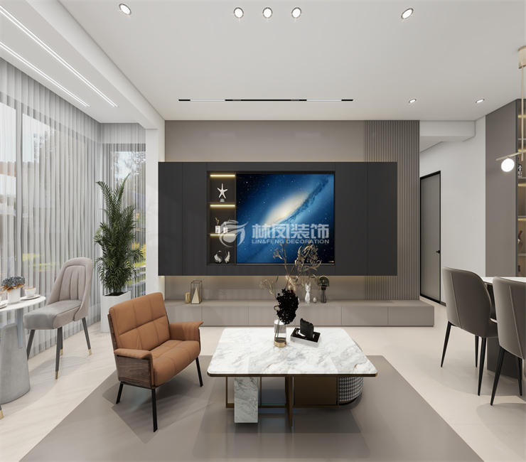 现代风的客厅电视背景墙采用悬浮背景墙加枪灰色格栅的设计,中间壁挂着电视。天花磁吸轨道灯加筒灯的设计整个空间给人一种简约舒坦的大气感。