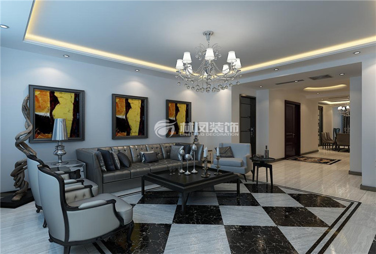 客厅的设计考虑到风水问题,所以次卧门一侧为沙发,入户门对面一侧为电视背景墙,电视背景墙两侧为石膏板抽缝造型,内侧粘贴壁纸,中间以黑镜作为区域的一个划分,层次感鲜明。沙发的搭配色彩偏向灰色。轻钢龙骨石膏板直线边棚的造型简约而不失大气,黄色虚光灯带增添富丽堂皇的感觉。