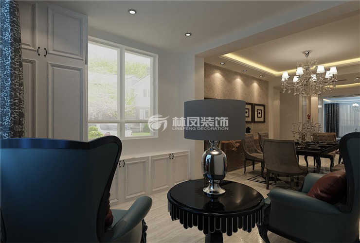 三室两厅一厨两卫,高层整体采用美式风格,色调以深色为主,体现美式的居家感和温馨感。