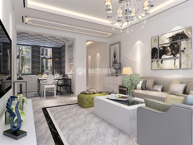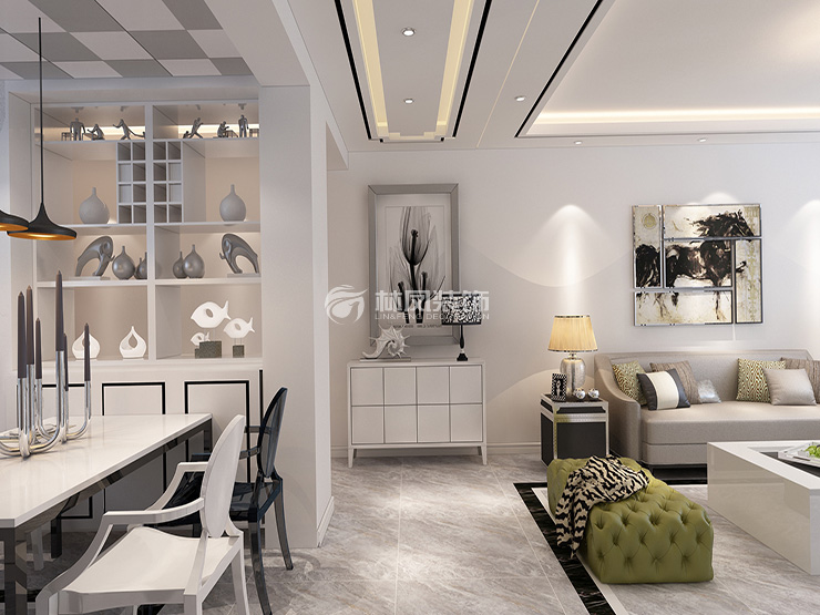 整个客厅空间以白色为主焕发一丝不染的高贵气息,地面大面积使用灰色瓷砖,又在多处运用了黑色线条修饰,看似简单随意,却在细节处彰显着艺术美学,至简的线条设计,没有一处多余的修饰,你千万别以为这是没有追求,因为白色灰色的世界中,那一抹亮眼的黑色,足以表达卓尔不群的个性。
