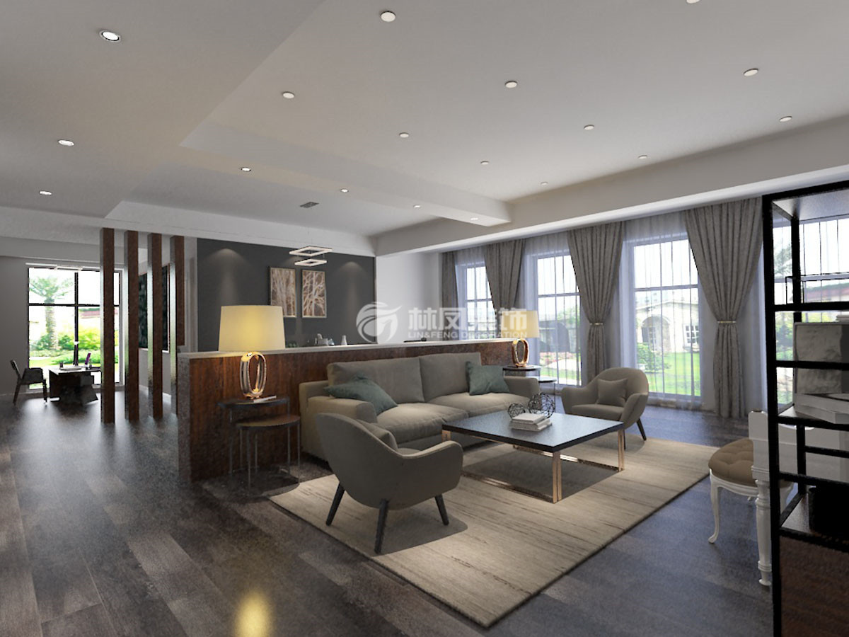 客厅开间很大,7.2米宽,客餐厅一体,中间用直线棚配上筒灯,正下方对应的吧台,也可以当做沙发的背景倚靠,把客厅和餐厅分隔开,又可以起到装饰作用,客厅业主不喜欢有主灯,这样就多放一些筒灯,达到合适的亮度以后,又不会很乱,显得简洁大方。业主家特殊的地方在于,不放电视机,为了孩子的健康成长,放上一个钢琴,左右两边配上搭配的装饰架,背景墙加以深色乳胶漆,呈现一个跳色的亮点。