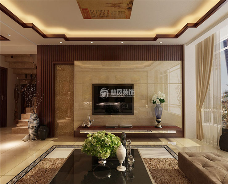 整体做了空间划分的掉棚。同事棚上也做了中式的实木线修饰。搭配实木与石材相融合的背景堪称绝配。同时做了一个隐藏门。方便出入主卧室也不尴尬。沙发后侧这是做了一个沙发背景。挂上几幅字画更能凸显中式的韵味。