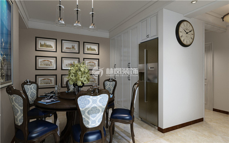 简约美式餐厅主要采用实木圆餐桌,实木的选择比较沉稳,家里客人比较多,满足了家人日常使用。