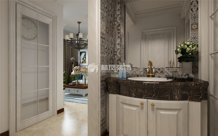 卫生间采用仿古AB砖的做法,让整个空间放大,淋浴区的花砖处理也显得更加有情调。