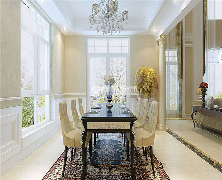 餐厅进行了重新的安排把整体墙面进行了拆除,餐厅和客厅进行了整体的贯穿。但是为了进行区分在餐厅的入口处有进行了两侧对应的罗马柱设计使得餐厅和客厅相互连接相互兼容。