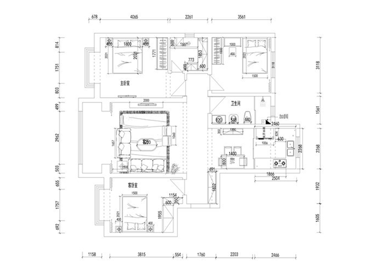 三室两厅一厨两卫,高层整体采用美式风格,色调以深色为主,体现美式的居家感和温馨感。