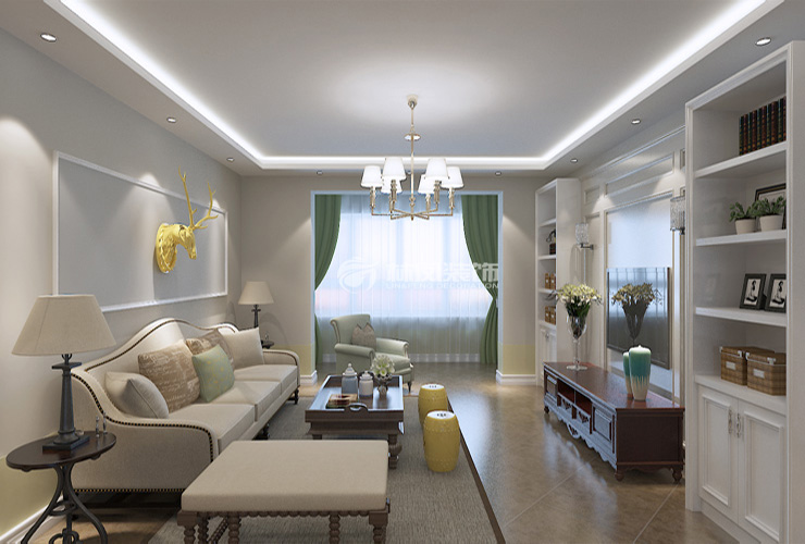 本案的客厅采用边常规的棚面造型,灰色的乳胶漆墙面为基础装饰,利用暖绿色作为墙面的点缀,使整体更加富有层次感,浅咖色色布艺结合的沙发,斜拼的仿古地砖,充满了怀旧风情,本案利用装饰柜作为背景墙装饰,不仅增加了其美观性,有大大增加了其储物空间,木色的电视柜与茶几,将其功能性完美的做出了划分,整体虽为混搭却又很和谐,深受业主喜爱。