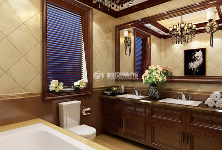 本案的卫生间,选择了米黄色为主的仿理石纹理的瓷砖,提升暖意,浴室柜选择了黑色烤漆的材质,更加的富有时尚感。