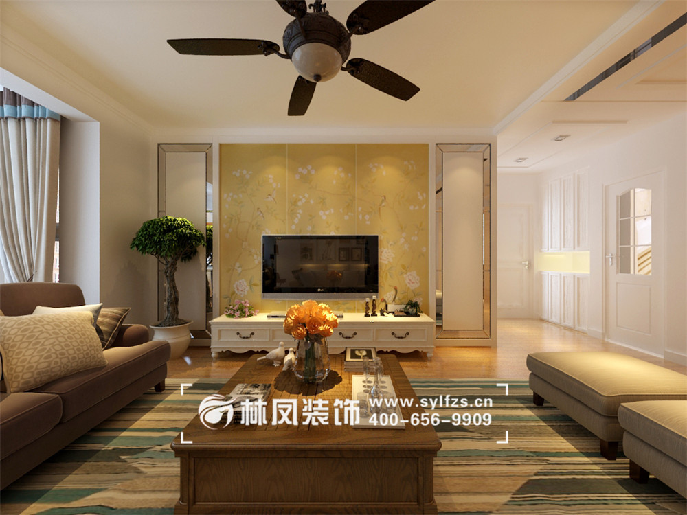 客厅没有设计复杂的吊棚,而是做了简洁的石膏线,电视背景墙是客厅的一个亮点,将硬朗的线条与美式感十足的壁纸结合到一起,体现了美式的时尚感,弧优美的家具款式运用高级灰、米白色色系搭配,来营造奢华 舒适感,素雅却不单调