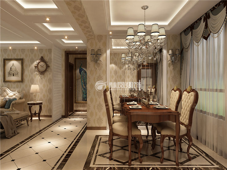 餐厅在整套户型中有独立的区域,欧式花纹餐椅的运用,为整个空间增添了颜色,使其不单调。餐厅背景设计为镜面造型,增加空间感的同时,在风水上也有催财的效果,棚顶天花运用方形直线吊顶,从天花中区分出了客厅和餐厅的空间,独立性更强。