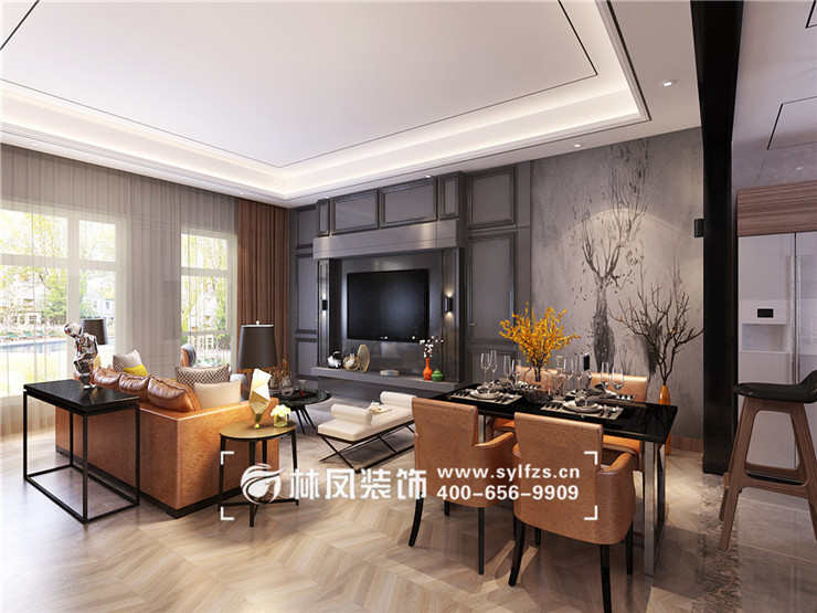 三室两厅一厨两卫,高层整体采用美式风格,色调以深色为主,体现美式的居家感和温馨感。