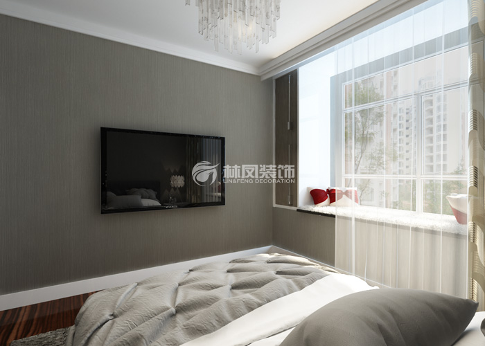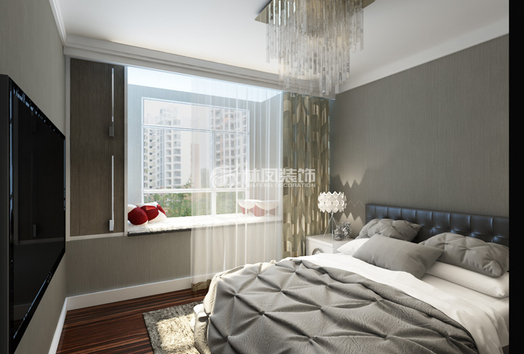 主卧室采用依然是现代港式的设计风格,颜色上大胆的采用灰色竖纹的壁纸黑白灰色的床与深红竖条的地板互为搭配。因为总体并不是黑白灰的基调,所以地板的颜色比较跳跃。也可以说是一次大胆的尝试,但是尝试的很成功,客户很满意。整体的空间颜色比较符合客户的想法