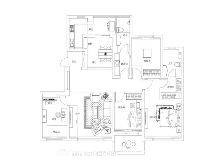 三室两厅一厨两卫,高层整体采用美式风格,色调以深色为主,体现美式的居家感和温馨感。