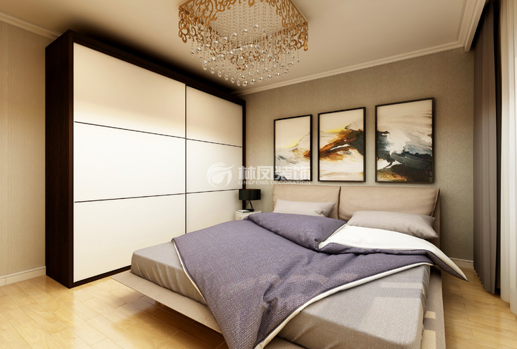 主卧室采用了灰色的壁纸来衬托这个空间,木色的地板透漏着年轻的气息,白色的衣柜简洁大方,充满现代气息的双人床与略带北欧感觉的挂画,形成了鲜明的对比,有对比有反冲。整体空间看似纷乱,其实早已融为一体。