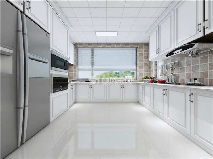 厨房是开敞的,厨房的要求就是功能强大又简单耐用。空间利用需要大的储物空间,宽敞的位置和足够的操作台面。在装饰上选择了仿古面的墙砖,更加展现简美的韵味。