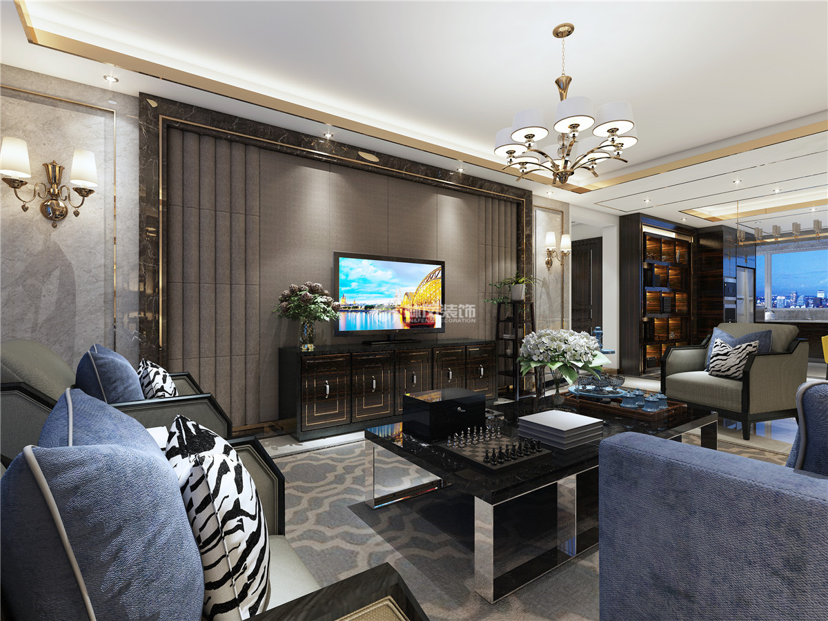 三室两厅一厨两卫,高层整体采用美式风格,色调以深色为主,体现美式的居家感和温馨感。