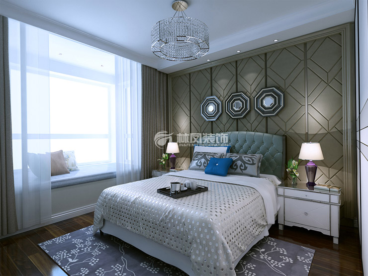 卧室地面采用地板铺设,有别于其他区域给人以安静温暖之感。床头背景墙采用几何形线条软包,与卧室线条感极强的吊灯交相辉映,灰色布艺窗帘为整体空间提升了稳重的气息,蓝色碎花地毯为整个空间添加了一丝活跃气息