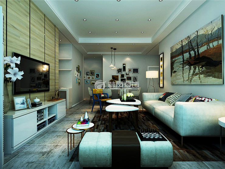 以性为主题的客厅,以原木色系为主题的背景在高级灰的沙发墙面与白色个性墙艺电视背景墙映衬下更加从容自在而不失家的温馨。米色落地灯在防古做旧地砖映衬下颇有些后现代工业韵味。