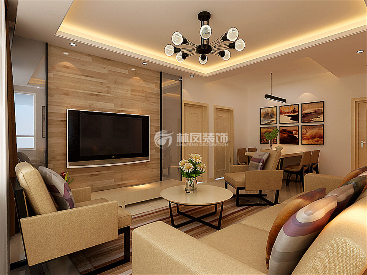 在客厅电视背景墙的造型上采用了木材设计,简化了线条,客厅沙发组合以米色为主,布料选用有质感的丝质面料,体现了现代风格的时尚,是个不错的搭配,地毯适脚感和典雅的独特质地与沙发的搭配相得益彰。