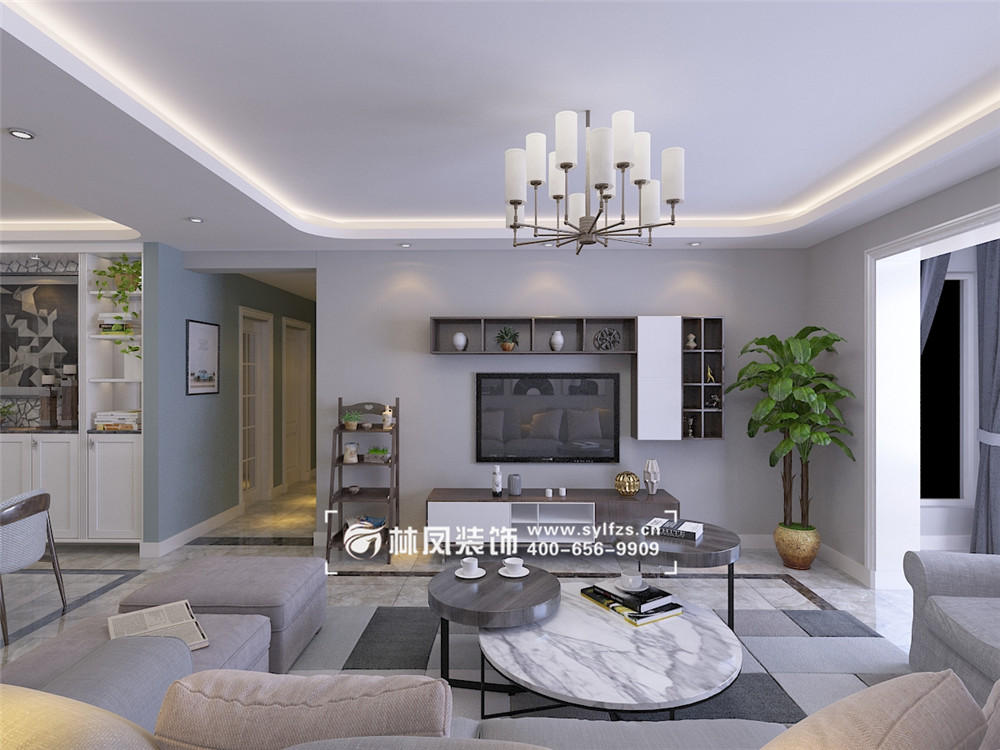三室两厅一厨两卫,高层整体采用美式风格,色调以深色为主,体现美式的居家感和温馨感。