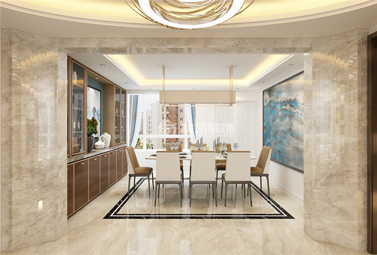 餐厅以理石台面餐桌搭配皮质餐椅,体现现代简约的感觉。
