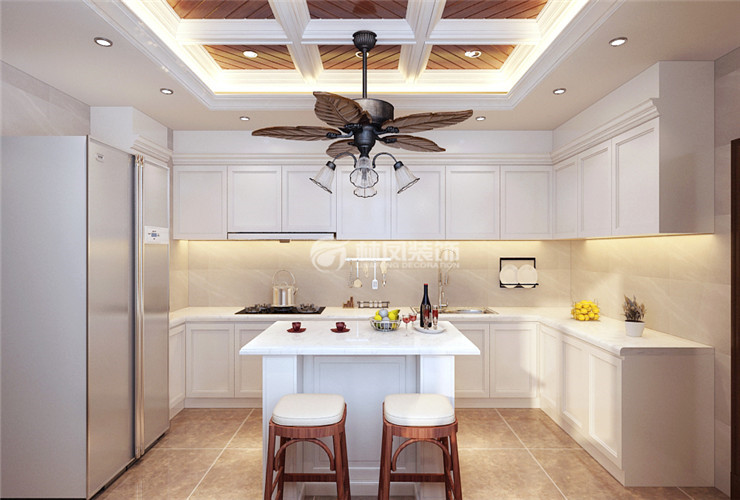 厨房以白色橱柜搭配灰色亚光墙砖,中间设计岛台增加实用性的同时,可以让主人空调制作一些面食,使得厨房为一家人增加一个能一起下厨的快乐时光。