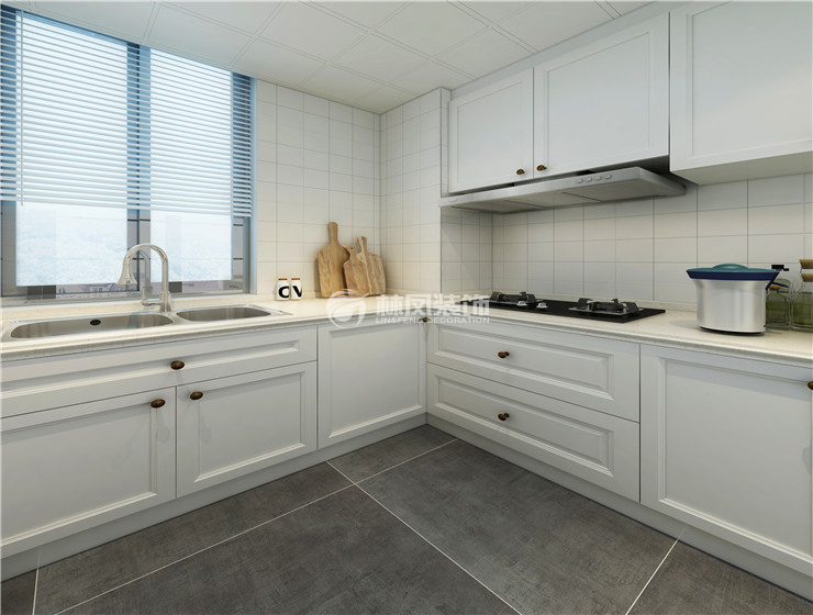 厨房以白色吸朔门板黑把手为主的橱柜设计,正面墙选用的白色亚光砖砖,再加上地面灰色哑光瓷砖作为搭配,能够让厨房更加的有质感,把现代厨房发挥的淋漓尽致。