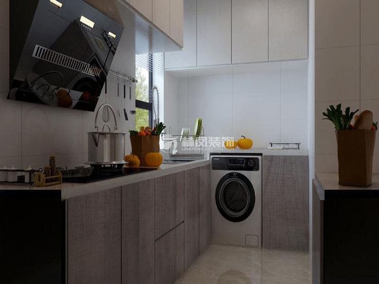 白色的釉面的墙砖、橱具门板灰色模压门,烹饪区、清洗区和储物区都会靠墙设计,适合长型区域的厨房,简单明了的直线布置,容易打理。