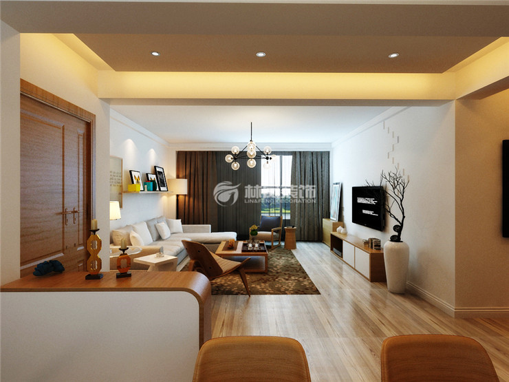 背景墙选着白色的文化石,没有规则的拼凑出了一个简单的图案,舒适的布艺亚麻沙发和原木色家具组成了整个客厅的空间,线条感极强的灯,突显简洁的主题!