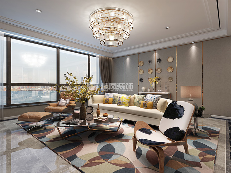 客厅拥有令人羡慕的采光,选用布艺沙发和实木单人位,温软的阳光照射下来,这种自然地气息会让人有种置身自然地感觉,背景墙采用理石装饰,黄铜的收边,及轮廓的配色,嵌入式的设计都是抢眼之处,两侧的镂空柜和装饰柜在美观的同时,也增加了储物空间,简单的吊顶,却因这盏吊灯显得更加尊贵。