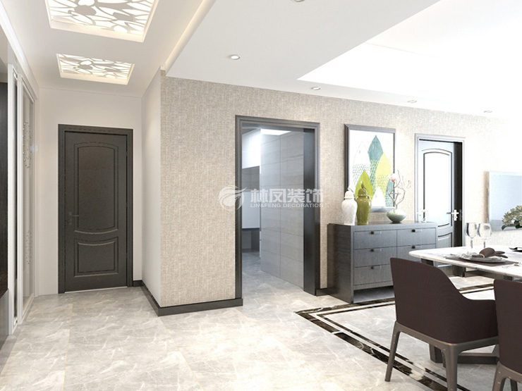 本案客厅用的是灰色的抛釉大地砖,用深色的瓷砖做圈边线,使得地面很有成次感,整体的吊棚考虑到用的中央空调,所以吊棚下来的比较多,沙发的背景是硬包坐垫造型,背景墙基本就是墙壁纸的铺贴,沙发是组合式的一套,和整体的电视柜茶几互相呼应。
