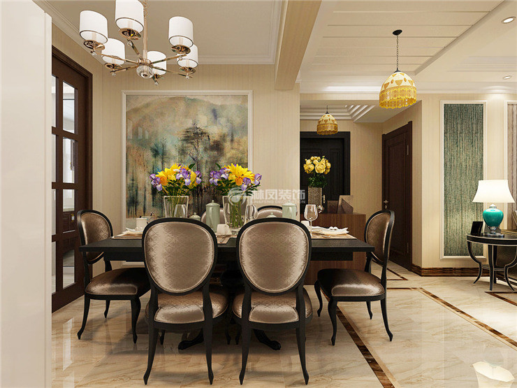 三室两厅一厨两卫,高层整体采用美式风格,色调以深色为主,体现美式的居家感和温馨感。