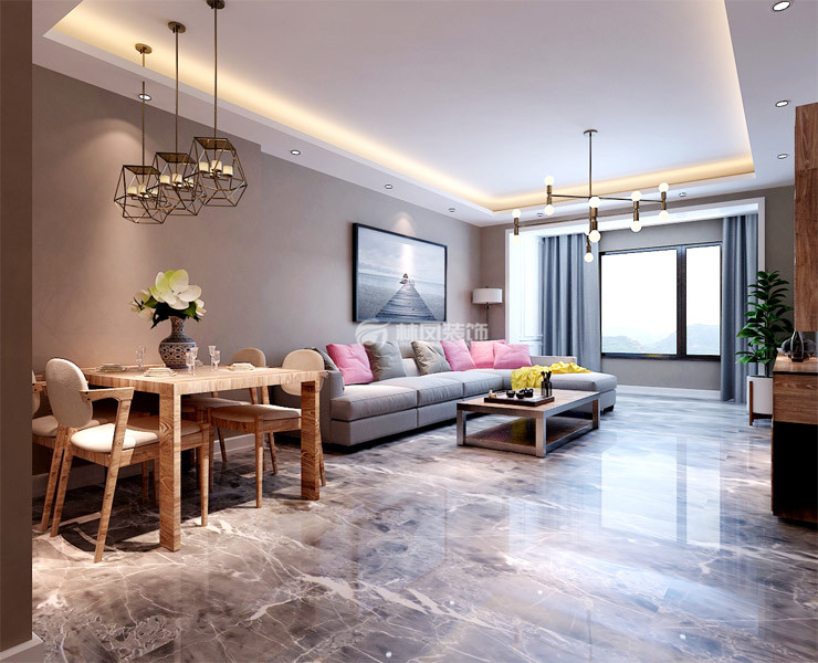 三室两厅一厨两卫,高层整体采用美式风格,色调以深色为主,体现美式的居家感和温馨感。