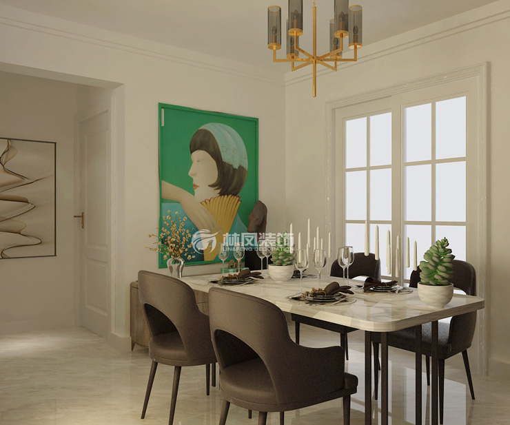 客厅整体以板木结合为主的家具,白色烤漆与深色木质纹理相结合,一深一浅的呼应,同时加入金色元素,整体展现出后现代风格的高端而不张扬的低调氛围。同时墙面的色彩运用AB面的乳胶漆,空间整体感觉活跃,在搭配上彩虹色的挂画,整体空间既有现代风格的 简约与大气,又有一些灵动的氛围。