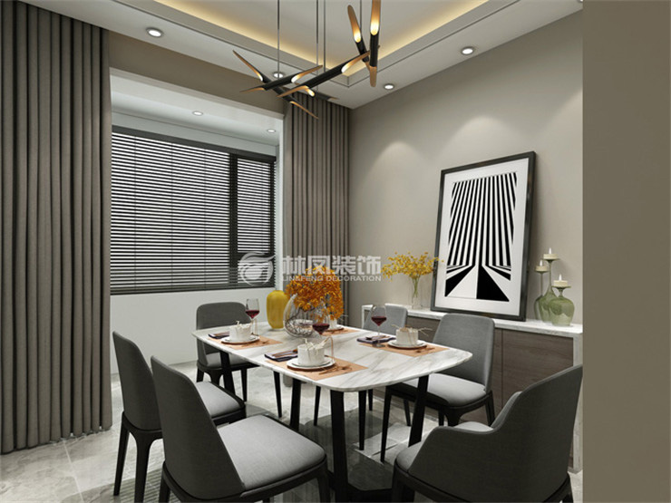 餐厅是一个独立的空间, 又优化了餐厅的空间布局,将原来的把人座改为六人座,同时加了边几,最大程度释放空间感。抽象的设计元素体现在设计师对灯具的挑选上,