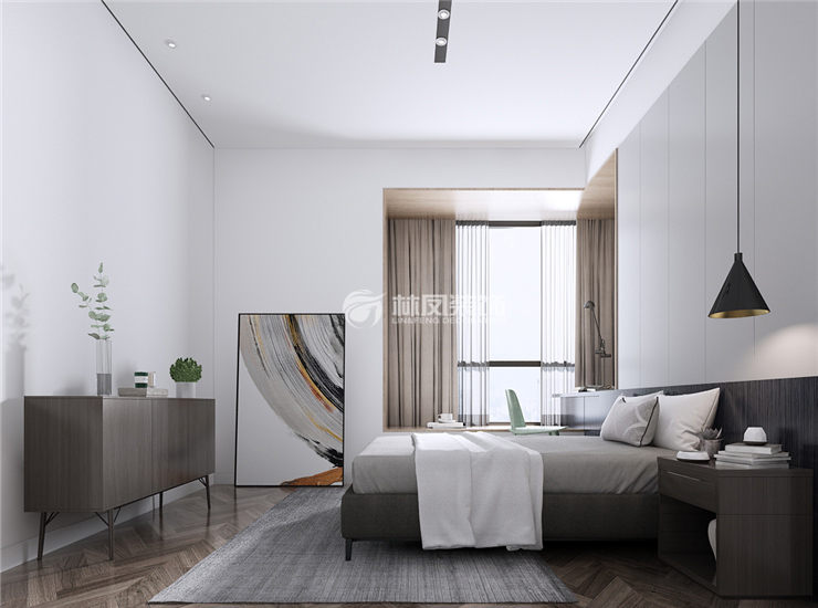 做为睡眠休息的空间,在颜色没有过多的使用亮丽的色彩而是选择了白色与灰色搭配。柔软舒适的大床是最佳的选择。地板的设计以鱼骨架斜拼为主。让卧室也变的惊鸿一瞥。