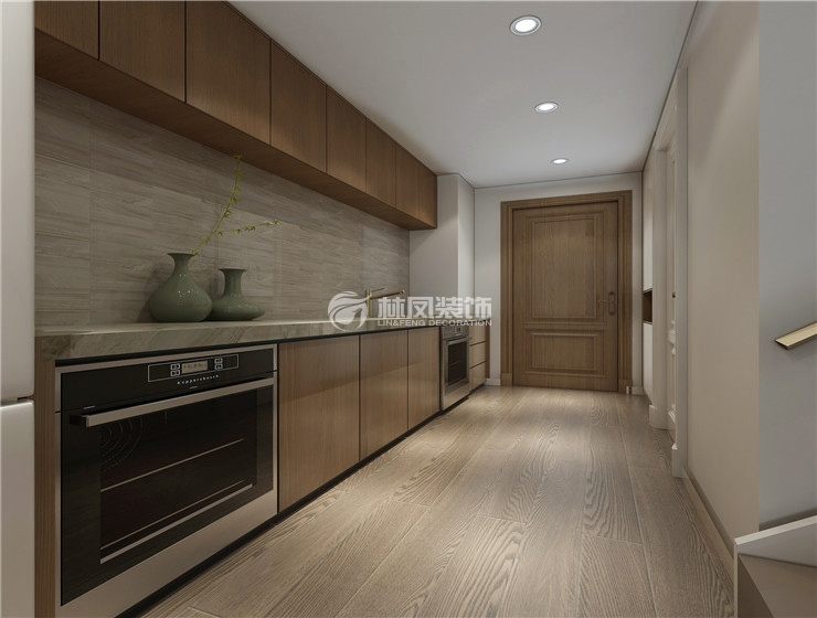 整体粘贴木纹暖色瓷砖,干净而不失温馨。整体打造L型橱柜,提高整体空间利用率,橱柜以原木色为主,干净明亮,自然气息浓郁。