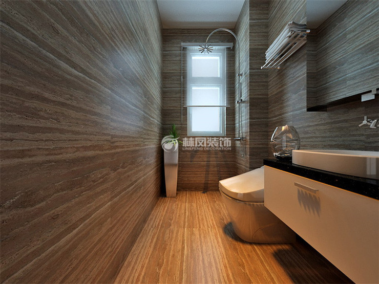 卫生间的效果是业主比较喜欢的,墙砖用的是灰色理石纹的墙砖,纹理线条清晰,洁具都是白色的,这使整个空间加大很多。