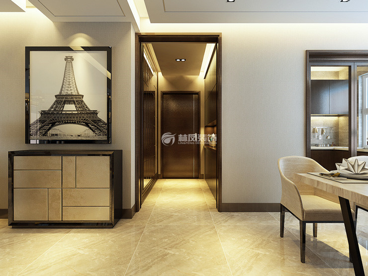 三室两厅一厨两卫,高层整体采用美式风格,色调以深色为主,体现美式的居家感和温馨感。