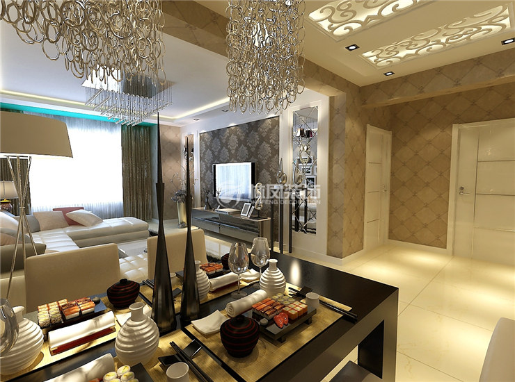 宽敞的空间,电视背景墙采用石膏跌级造型为主,再配上倒棱水印镜片和壁纸做背景,简约时尚的同时少不了大气,后期其他墙面以格式壁纸底色做陪衬,再搭配上一套超现代化的家具和灯具瞬间让整个空间感觉更加时尚诙谐