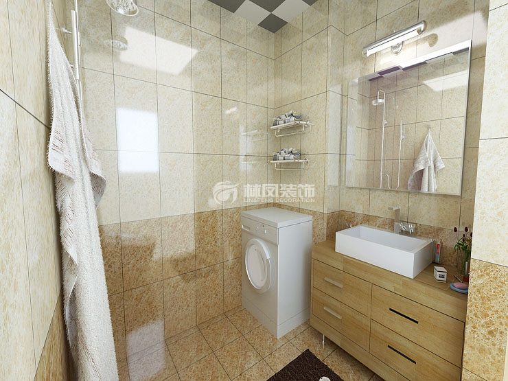 卫生间理石纹理的AB版墙砖搭配,给人一种层次分明奢华的感觉,实木的成品手盆,陪上实用陈列架,淋浴花洒,满足家庭成员在洁体、卫生、工作方面的需求。