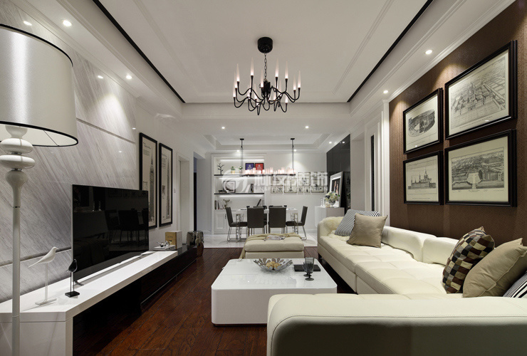 因为混搭风格带有简美元素,所以为了体现出美式的那种深色沉稳感,客厅采用深色实木三层地板。