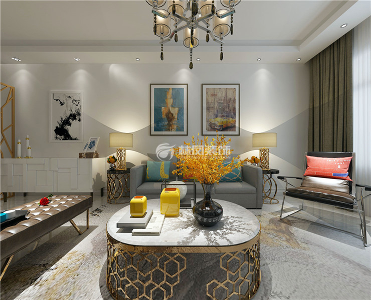 整个客厅电视背景墙以深色大理石为主,用金色的线条,使更加生硬的石材,显着更加别具一格,让整个空间更加灵动,灰色的地砖,让空间大气生动。