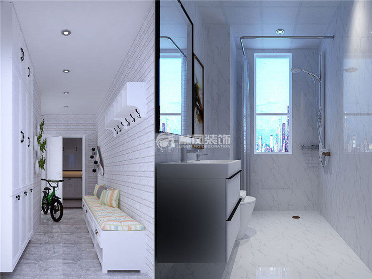 简单实用美观,主卫生间运用黑白色系皮纹砖墙地砖的铺设使空间不会显得那么传统,多了一些质感。次卫生间,做的比较简单,运用浅色的花纹墙地砖,空间虽小但是也能体现精致。