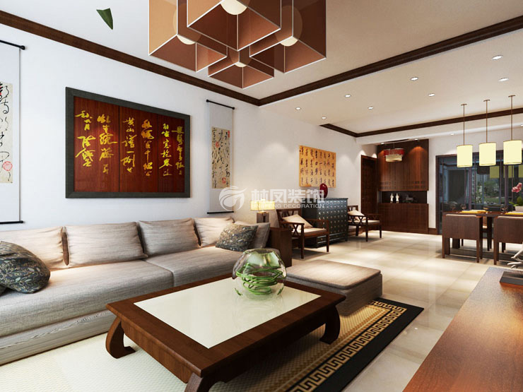 餐厅吊棚与客厅一样,胡桃木圈边,餐厅不做造型墙,餐桌墙面用成品的装饰品装饰。