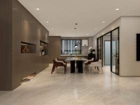 设计师整体设计理念:本案以现代元素为主,采用理石质感的石材,搭配暖灰色木质定制类家具,配以亚麻质感的软装饰品,打造一种现代时尚简洁的居住空间
