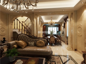 建筑面积虽然330平,但是因外建露台和扩充房间。实际面积可以达到450平,考虑到房主的要求,整体设计定义为现代欧式,搭配古典家具来提升空间升华。同时客厅以挑空的形式来营造欧式风格的建筑的特点,同时搭配上罗马柱以配合整体风格的延伸性。