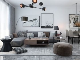 本案以黑白灰为基调,在空间处理上主要表现轻松自然,色彩要求大小色块组合,低彩度、线条简单突出现代简约。